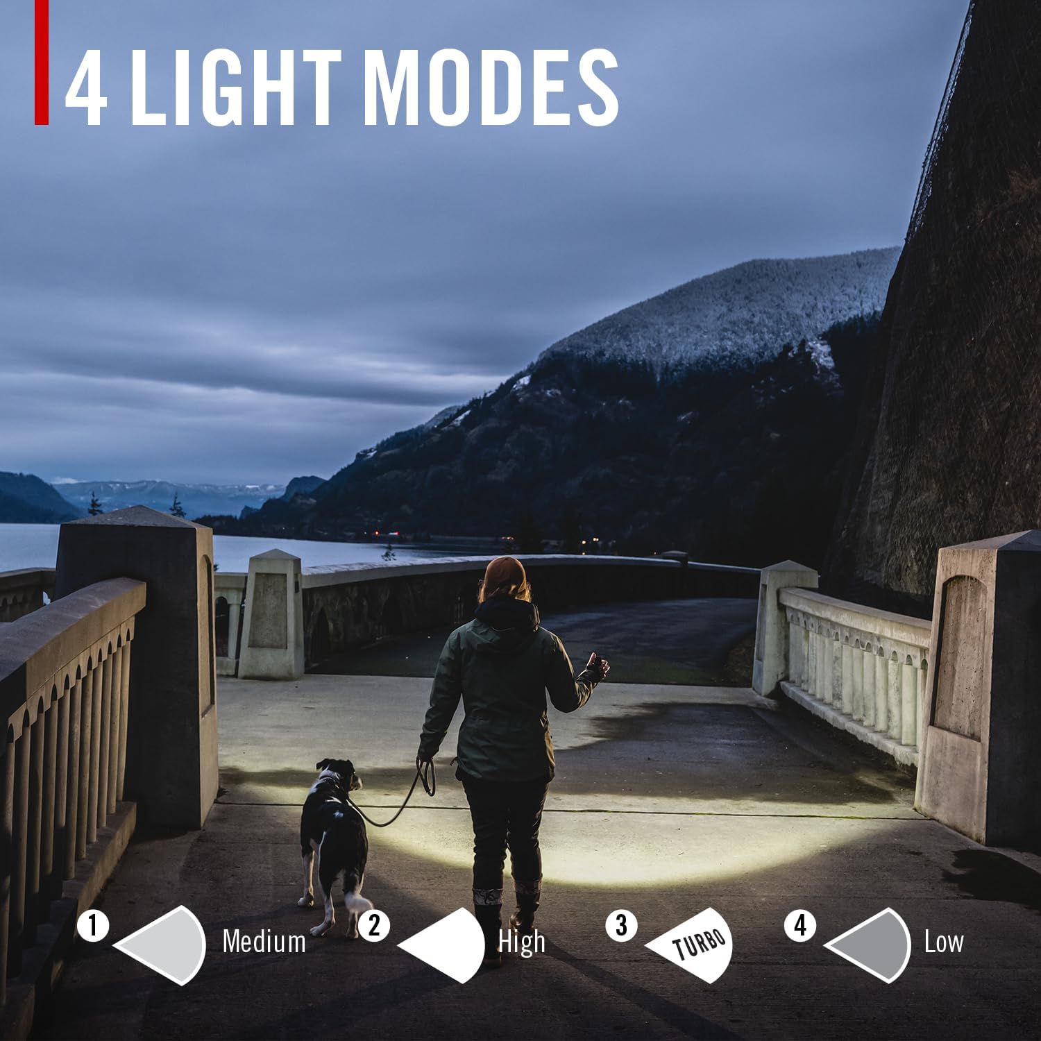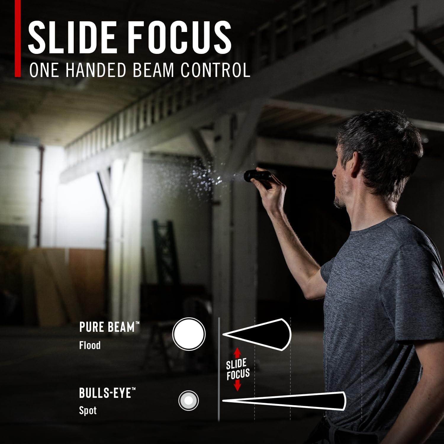 4つのモード(ミディアム・ハイ・ターボ・ロー)で最大1500ルーメンの明るさです。SLIDE FOCUSシステムを搭載し、スポット⇔ワイドの切り替えをシームレスに行えます。