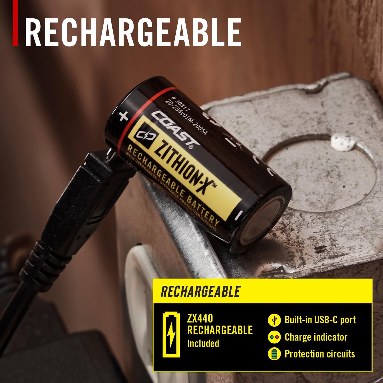 COASTの専用充電池(ZX440)が付属しており、USB-Cポート付きの充電池に直接充電が可能です。